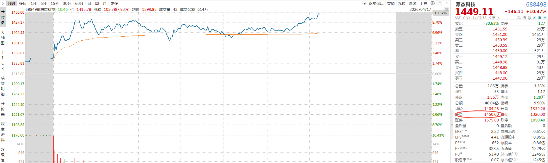 4月17日,A股高价股格局迎来历史性改写,一场关于市场风格的深刻变革正式浮出水面。源杰科技(688498)盘中强势拉升,涨幅达10.27%,股价最高触及1450元,创下历史新高。成功超越了贵州茅台,登顶A股最高股价股王宝座,凌厉走势印证了高科技赛道的崛起。截至4月17日14时许,公司股价报1447.79元,今年年初以来累计上涨已超125%,上市至今涨幅超过1564%,是A股市场高成长赛道的绝对龙头。