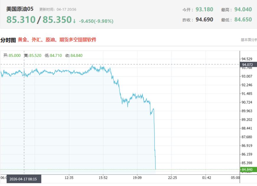 4月17日,WTI原油期货价格跌10.14%,报85.090美元/桶,4月初以来美油已累计大跌19%;布伦特原油期货向下跌破90美元/桶,最新报89.992美元/桶,日内下跌9.46%。
