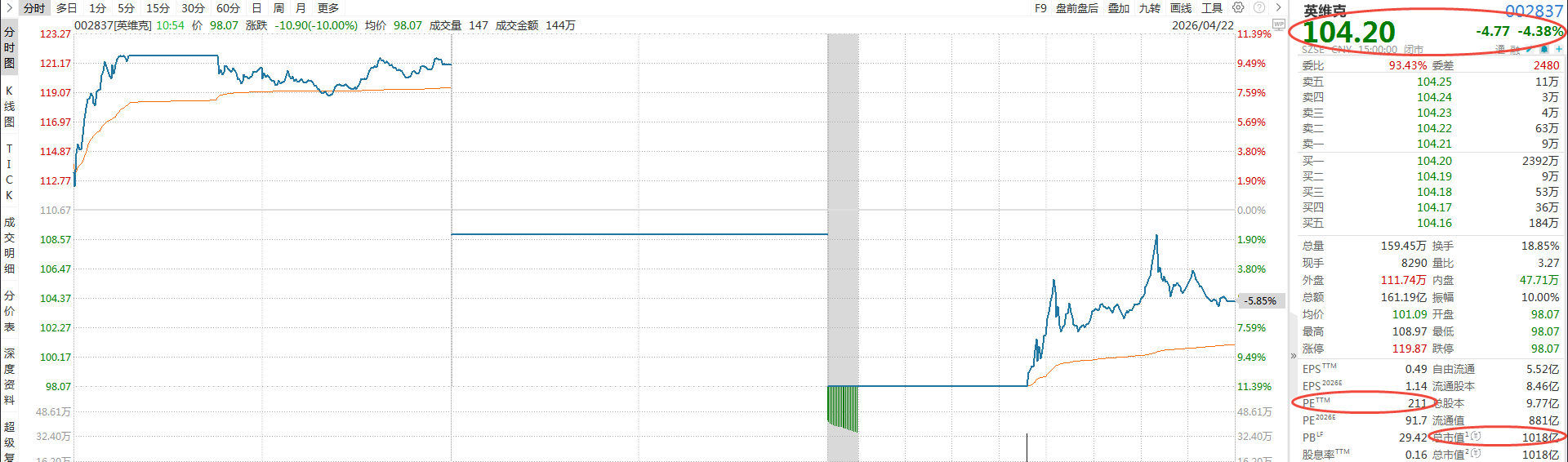 4月22日,二连板跌停开盘的英维克在午盘前(002837)打开跌停板,午后跌幅一度收窄至-0.01%,几近翻红个股以一字板跌停开盘,最终收报104.2,下跌4.38%。今日成交额暴增至161亿元,换手率高达18.85%,市值收在1018亿元。资金博弈痕迹明显,成为当日最受关注的人气股。
