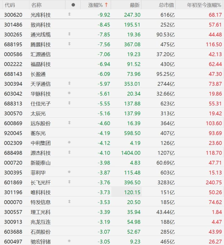 A股市场光纤概念(核心股)股集体下跌,其中,光库科技跌近9%,致尚科技跌超8%,通光线缆、腾景科技、汇源通信跌超7%,福晶科技、长盈通跌超6%,天孚通信、华脉科技、仕佳光子、太辰光跌超5%,远东股份、衡东光、中利集团、源杰科技跌超4%,长飞光纤跌近4%。