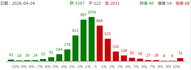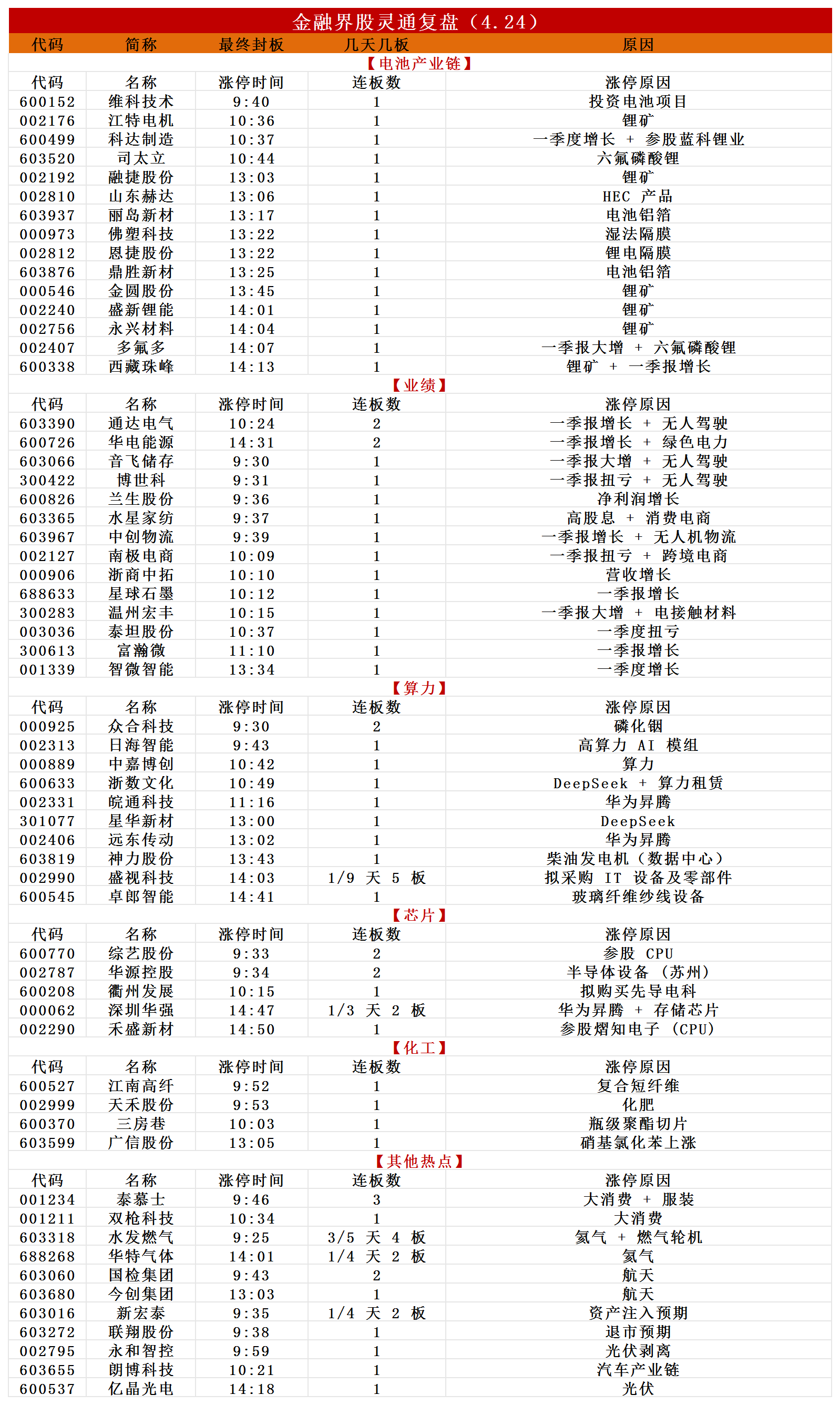 4月24日,短线情绪低迷,全市场超3300只个股下跌,20股跌停。其中高度板(昨5连板)金螳螂跌停,人气股西部材料跌停,市场连板高度降至3连板。从板块来看,算力(核心股)产业链持续调整,新易盛业绩不及预期,大跌超11%,全天成交额高达501亿,位列A股历史A第四,仅次于东方财富、中国石油与中国平安。锂矿概念集体爆发,盛新锂能、金圆股份、融捷股份、江特电机、西藏(核心股)珠峰涨停,天齐锂业触及涨停。芯片产业链震荡拉升,综艺股份2连板,富瀚微20cm涨停,华虹公司、杰华特涨超10%。化工(核心股)板块表现活跃,广信股份、江南高纤、天禾股份、三房巷涨停。