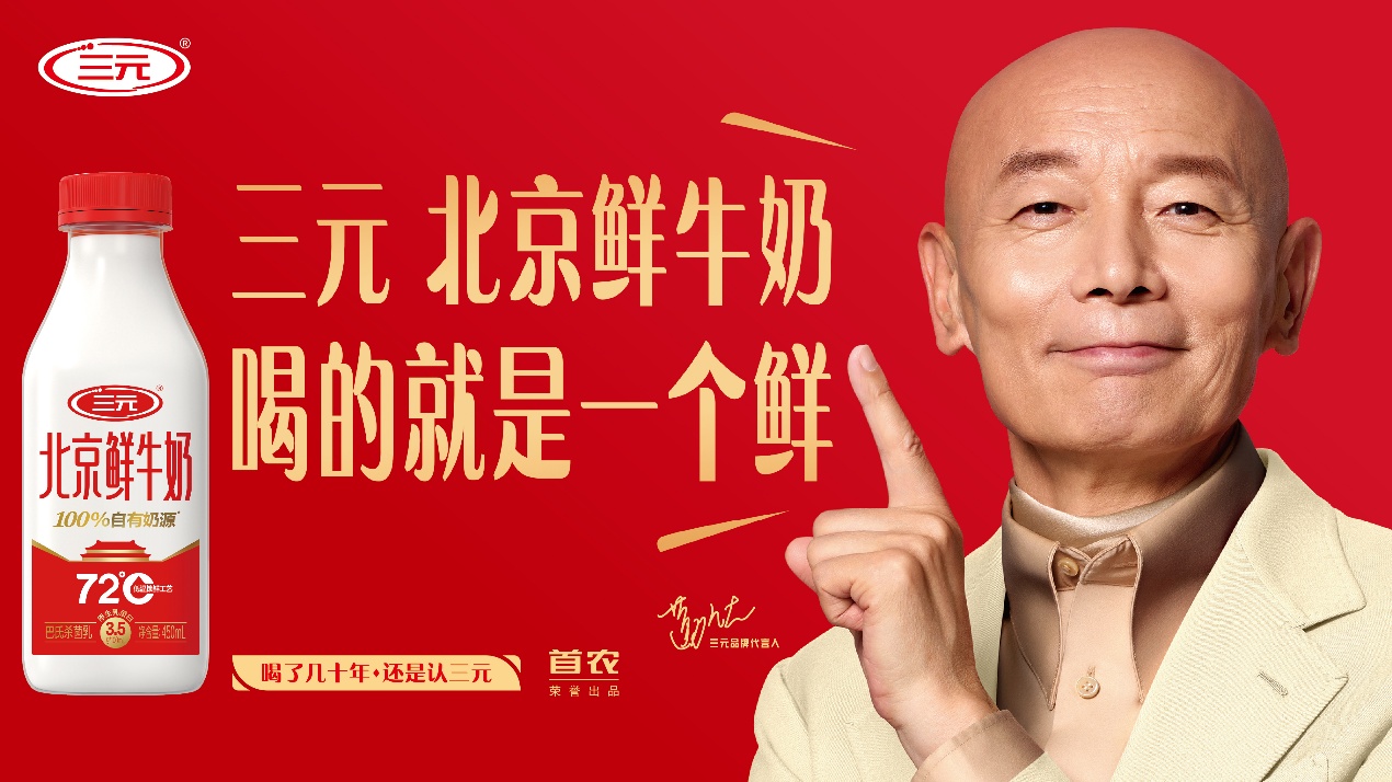 2025年推出的“北京鲜牛奶”是这一策略的试水者。该产品依托72℃低温巴氏杀菌工艺与7天短质保,依托极致供应链,达成当天生产、当天上架,主打“家门口的 才真鲜”,并通过葛优与丁禹兮的“双代言人”尝试触达不同年龄段客群。