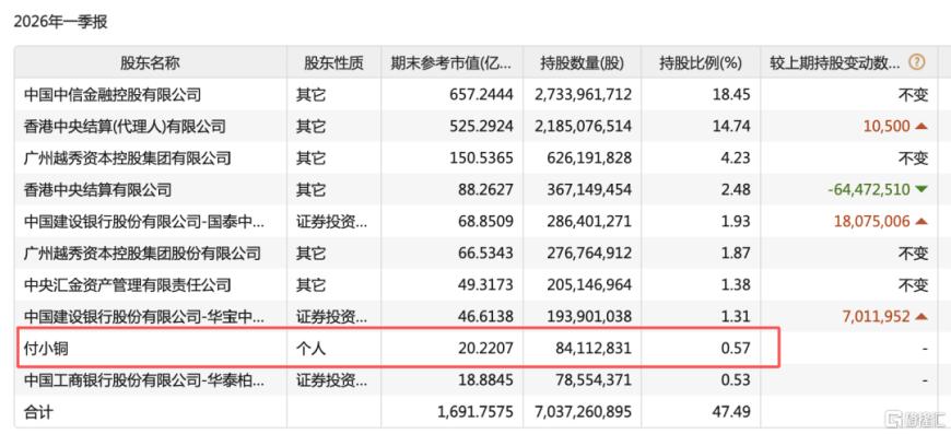 此外,自然人付小铜持有中信证券8411.28万股,跻身公司前十大股东之列,持股比例为0.57%。