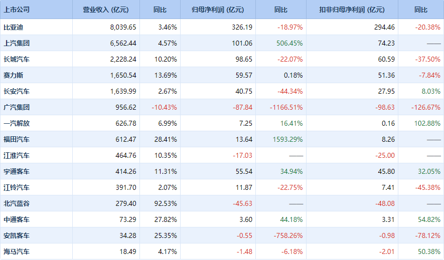 在15家车企中,6家出现亏损,占比达四成。其中,比亚迪以8039.65亿元营收居行业首位,同比增长3.46%,但归母净利润为326.19亿元,同比下降18.97%,扣非净利润亦下降20.38%,终结了连续三年的高增长态势。