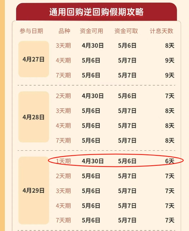 单从计息时间来看,目前最佳操作日期是4月29日(周三),操作1天期逆回购,可享受6天的利息,4月30日资金可用,5月6日资金可取。值得注意的是,4月30日是假期前最后一个交易日,如果在这个时间操作逆回购,投资者将享受不到假期收益。