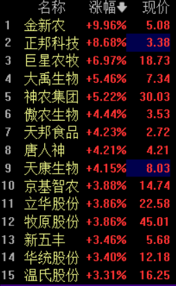 A股早盘,猪肉概念集体反弹,金新农涨停,正邦科技、巨星农牧、神农集团、天邦食品、唐人神跟涨。消息面上,中共中央政治局4月28日召开会议,分析研究当前经济形势和经济工作。会议强调,抓好农业生产,稳定生猪等农产品价格。